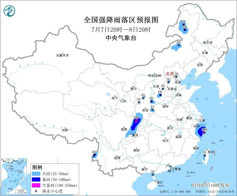 ■中央气象台7日18时发布暴雨黄色预警:7日20时至8日20时,浙江中东部、四川东部、陕西中部和西南部、重庆西南部、云南西北部、台湾岛西部、内蒙古东北部、山西中南部、河北中部等地部分地区有大到暴雨,其中,浙江东南部、四川东北部等地局地有大暴雨(100至200毫米)。